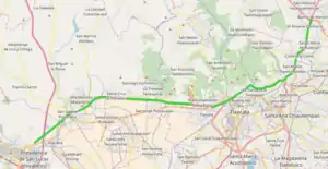 The 11 kilometres (6.8 mi) Libramiento de Tlaxcala serves as a southern bypass of the city, connecting the highway to Texmelucan, the state toll road between Puebla and Tlaxcala, and Mexican Federal Highway 121. It was inaugurated on March 27, 2015.[3] The bypass's construction began in 2009, with three kilometers remaining unfinished from 2012 to 2015.[4]