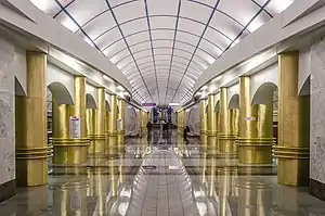 Mezhdunarodnaya (Russian: Международная) (literally - international) is a Saint Petersburg Metro station on the Frunzensko-Primorskaya Line (Line 5) of the Saint Petersburg Metro. It was opened on December 28, 2012 together with Bukharestskaya as an extension of the Frunzensko-Primorskaya Line.[1][2] It was the southeastern terminus of the line until 3 October 2019, when an extension of the line to the south with three stations, Prospekt Slavy, Dunayskaya, and Shushary, was opened.[3][4]