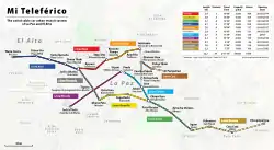 Mi Teleférico (Spanish pronunciation: [mi teleˈfeɾiko], English: My Cable Car), also known as Teleférico La Paz–El Alto (La Paz–El Alto Cable Car), is an aerial cable car urban transit system serving the La Paz–El Alto metropolitan area in Bolivia.[5] As of October 2019, the system consists of 26 stations (36 if transfer stations are counted separately per line) along ten lines: Red, Yellow, Green, Blue, Orange, White, Sky Blue, Purple, Brown, and Silver. Further lines and extensions are in planning or construction.[2]