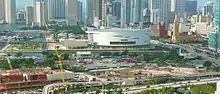 On March 25, 2014, David Beckham announced plans to build a 25,000-seat stadium at PortMiami, adjacent to the Miami Heat's American Airlines Arena (now known as Kaseya Center) in the Downtown area of the city.[3] Under the proposal, the stadium would have been located at the southwest corner of Dodge Island and be accessible by a pedestrian bridge from Biscayne Boulevard and the American Airlines Arena.[4]