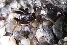 Micaria pulicaria is not ant hunting, although it associates with ants,[4] and it quivers its front legs to mimic ant antennae which may help prevent it falling prey to those larger spiders which generally avoid contact with ants. The females enclose the eggs within a stiff sac resembling a rimmed pot and although she does not guard them, she does return frequently to check it. The adults have been recorded from early February to late November, although they may occur throughout the year. The main season is from late spring until mid-summer.[5]