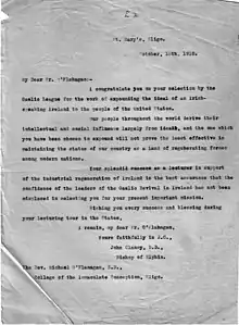 Letter from Bishop Clancy to Fr. Michael O'Flanagan, 1910, congratulating him on his selection as an Envoy for the Gaelic League in the United States.