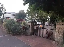![]() Front gate of Michael Oak Waldorf School with the school hall visible in the background behind the sign. | |