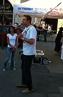 Before he joined the German Freedom Party he had been the press spokesman for the Christian Social Union in Bavaria (CSU).[5] He has cited the death of his party colleague Ralph Burkei in the 2008 Mumbai attacks as a formative event for his anti-Islam beliefs.[4] He was elected to the federal executive board of the German Freedom Party in 2011, but due to his radical Islamophobic attitude, his election led to the resignation of several state executives and many members.[6] He had previously been relieved of his positions in the party after a blog post that called for Muslims to be forced to leave the country unless they renounced their faith.[7] He was elected leader of the party after René Stadtkewitz resigned in 2013, and held the position until 2016 when the party was dissolved in favour of the Alternative for Germany (AfD).[8]