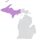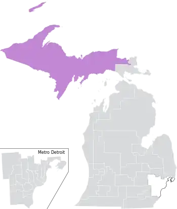The district was located entirely within Michigan's 1st congressional district, and overlapped with the 108th, 109th, and 110th districts of the Michigan House of Representatives.[7] It bordered the state of Wisconsin, as well as Lake Michigan, Lake Superior, and Canada via a water border. At nearly 13,000 square miles (34,000 km2), it was the largest Senate district in the state.[1]