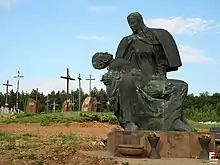 Political and economic changes that took place in Poland after 1989 resulted in the split of the Honorary Committee. This fact, as well as financial difficulties, forced modification of the project and significantly delayed its implementation.[119][120] However, the idea of building a mausoleum has never been abandoned. On May 9, 1991, the "Monument-Mausoleum" Foundation was established in Michniów.[121] In July 1993 – on the 50th anniversary of the pacification – the "Pieta Michniowska" statue by Wacław Stawecki was unveiled in Michniów.[122] In July 1997 a new House of National Remembrance was opened. Since then, it houses a permanent exhibition and research center documenting the martyrdom of the Polish countryside during World War II. At the same time, the so-called Sanctuary of the Martyr's Polish Village, where crosses symbolizing Polish villages pacified by the Germans in 1939–1945 are placed[123] (there are currently several hundred of them). A monument "Pożoga Wołyń" was unveiled in the sanctuary, commemorating Polish villages murdered in Volhynia by Ukrainian nationalists.