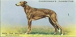 Mick the Miller (29 June 1926 – 6 May 1939) was a male brindle greyhound. He is celebrated as the first great racing greyhound to compete in England (although he was born in Ireland). Despite a short three-year racing career, his achievements were highly publicised around the world and by the end of his career he had become an icon in the sport. His achievements include winning nineteen races in a row, including the English Greyhound Derby on two successive occasions. He suffered an injury at Wimbledon Stadium whilst racing which broke the streak in 1931, and once recovered was beaten in the attempt to win a third Derby title. He went on to appear in films, and is still considered one of the greatest sporting heroes in the UK.[1]