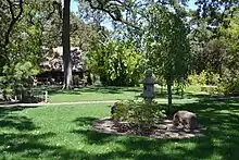 The Japanese-American Citizens' League developed the three-acre Japanese garden at Micke Grove.[10][11] It was created in 1959 and designed by the landscape architect Nagao Sakurai.[12] It was opened in 1965.[13] The garden includes fish ponds with stepping stones and koi fish, and a five-story pagoda lantern donated to the park by Lodi's sister city, Kofu, Japan.[12] The 200 koi fish were donated by the Japanese Agricultural Department.[10]