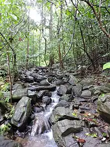 ![]() Micrixalus elegans amongst leaf litter and fallen logs near a fresh-water stream. |