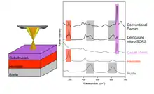 Micro-spatially offset Raman spectroscopy (micro-SORS) is an analytical technique developed in 2014 that combines SORS with microscopy.[1] The technique derives its sublayer‐resolving properties from its parent technique SORS.[2] The main difference between SORS and micro-SORS is the spatial resolution: while SORS is suited to the analysis of millimetric layers, micro-SORS is able to resolve thin, micrometric-scale layers. Similarly to SORS technique, micro-SORS is able to preferentially collect the Raman photons generated under the surface in turbid (diffusely scattering) media. In this way, it is possible to reconstruct the chemical makeup of micrometric multi-layered turbid system in a non destructive way. Micro-SORS is particularly useful when dealing with precious or unique objects as for Cultural Heritage field and Forensic Science or in biomedical applications, where a non-destructive molecular characterization constitute a great advantage.[3]