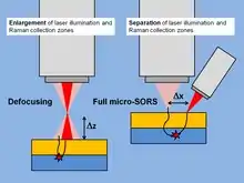 This more sophisticated micro-SORS variant provides a complete separation of laser excitation and collection zones (Δx offset) that requires a hardware or a software modification to a conventional Raman microscope. The separation can be achieved by using an external probe or fibre optics to deliver the laser,[13] by displacing the laser spot by moving the beam-steer alignment mirrors,[5][6] by using a spatially resolved CCD,[4] by using a digital micro-mirror device (DMD),[14] by moving the tip of the Raman detection fibre to perform an off-confocal detection of the signal[15] or by combining hyperspectral SORS and defocusing micro-SORS.[16] Full micro-SORS was proven to be more effective in terms of both penetration depth into the sample and relative enhancement of sublayer signal[13]
