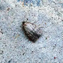 The wingspan is 6–9 mm. The resting position is flat, with the forewing hind margins against each other. The hindwing venation is bifid. The head, patagia and prothorax are blackish, while the rest of the thorax and ground colour of the forewing is unicolorous dark greyish brown. All crosslines of the forewing are present and black. The fringes are grey. The hindwing is light greyish brown. The underside is unicolorous light brown, with a weakly marked postmedian line and a discal spot.