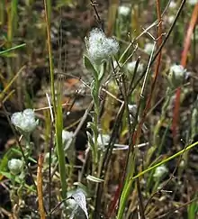 Micropus californicus is a plant in the family Asteraceae which is known by the common name slender cottonweed. Its flowerheads resemble very small cotton balls, often rounded with cottony white hairs forming the pappus of each seed. The individual plants are known more informally as Q-tips due to their resemblance to the cotton swabs. It is found mostly in California, and into Oregon and northern Baja California. This plant is a resident of the vernal pool plant community.