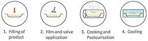 The MicVac method is a pasteurization method for the food processing industry producing ready meals. Food ingredients are inserted into a package, which is sealed. The food is then cooked and pasteurized in the sealed package. During the heating process a valve on the package opens and releases steam and oxygen. The process time is short since the food is pasteurized with microwaves. When the microwave heating process stops the valve closes. Remaining steam condenses and causes an underpressure in the package. The final result is a cooked, pasteurized and vacuum-packed product. The short cooking time in combination with the absence of oxygen in the pack is unique for the method and has many advantages. The method has been used in the food industry since 2005.