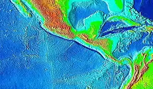 The Middle America Trench is a major subduction zone, an oceanic trench in the eastern Pacific Ocean off the southwestern coast of Middle America, stretching from central Mexico to Costa Rica. The trench is 1,700 miles (2,750 km) long and is 21,880 feet (6,669 m) at its deepest point. The trench is the boundary between the Rivera, Cocos, and Nazca plates on one side and the North American and Caribbean plates on the other. It is the 18th-deepest trench in the world. Many large earthquakes have occurred in the area of the Middle America Trench.[1]