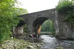 The 1840 bridges were designed by George Washington Whistler, and constructed by the firm of Alexander Birney. Of the original nine stone bridges built, only three survive, all of which are now out of service. Some of the bridges were either demolished or encased in concrete during work performed in 1912 and 1927, and one bridge was demolished in 1927. One of the listed bridges (#4) was built of concrete in 1912, adjacent to one of the 1840 stone bridges (#3) that was taken out of service. The one steel truss bridge was built in 1912 by the Pennsylvania Steel Company.[3] The district was added to the National Register of Historic Places in 1980.[1] A hiking trail providing viewing points to the lower seven bridges was opened in 2004. All of the bridges are viewable via whitewater-appropriate watercraft from the river.