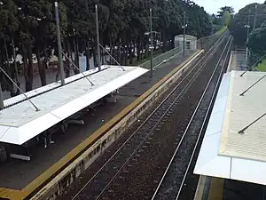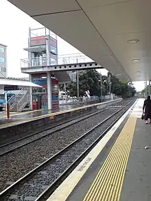 Middlemore railway station is on the Southern Line and Eastern Line of the Auckland railway network in New Zealand. The station has side platforms on the northbound and southbound lines connected by a pedestrian level crossing at the south end of the platforms. Access to the station is via Hospital Road: it is next to Middlemore Hospital.