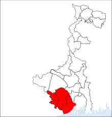Midnapore district was a district of British India. This district was bifurcated on 1 January 2002 into the Purba Medinipur district and the Paschim Medinipur district.[1] On 4 April 2017, the Jhargram subdivision of Paschim Medinipur district (which formed part of the undivided Midnapore district) was converted into Jhargram district.