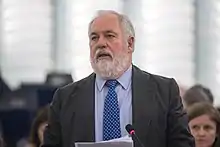 In 2014, Arias was picked by Rajoy to lead the People's Party's list in the 2014 European elections.[10] Following the elections, Spain nominated him for the Juncker Commission in August 2014.[10] By early September, European Commission President Jean-Claude Juncker assigned Arias to the office of European Commissioner for Climate Action and Energy, where he became the first single supervisor of those two policy areas.[11] He took office on 1 November 2014.[12] In this capacity, he works under the guidance of Maroš Šefčovič, the European Commission Vice President for Energy Union.