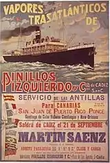 In the 1880s the enterprise was taken over by Miguel's son and also Miguel’s father, Antonio María Martínez de Pinillos Izquierdo (1843-1926);[7] under his management the enterprise reached its golden age. Antonio modernized the fleet by switching to steamers and operated new regular routes both on the Atlantic and on the Mediterranean, opening a base in Santander and trying to serve also Northern Europe and the Far East. His company, first named Pinillos, Sáenz y Cia. and since the 1890s Pinillos, Izquierdo y Cia., together with its major competitor Trasatlántica became key player on the Spanish transatlantic routes.[8] Serving as councillor in ayuntamiento[9] and with members of other Martínez de Pinillo branches acting as top local officials, Antonio became the provincial business mogul; the family grew among the most prominent ones in Cádiz.[10]