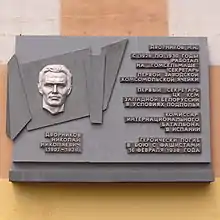A memorial plaque to Mikalai Dvornikau on the walls of the plant "Gomselmash". Installed in 1970.
