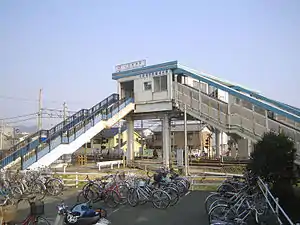 The station has two opposed side platforms connected to the elevated station building by a footbridge. The station building has automated ticket machines, TOICA automated turnstiles and is unattended.
