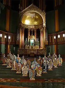 A second installation in this vein is Popes, an arrangement of 21 papal figures, each approximated four-feet tall and decorated with painting and metal leaf, installed in St. Paul the ApostleCchurch in autumn 2009.