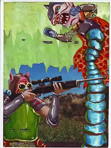 Estabrook uses painting to many ends. Most often, purposeful vandalism is his intention. Works in this vein include "An Army of One", in which he defaced army recruiting propaganda and then returned it to its distribution point. Related to this is the "Gun Mags" series in which Estabrook paints out all the text of gun magazine pages except sexualized words like "cock" or "butt". He then paints monsters on the guns and people posing with them.