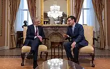 On October 26, Johnson met with Prime Minister Anthony Albanese of Australia during the latter's state visit to the United States.[78] Later that day, he also met with President Joe Biden for the first time as speaker before attending a bipartisan briefing held at the White House on the administration's proposed funding requests for aid to Ukraine and Israel.[79] On October 30, Johnson suggested rescinding IRS funding from the Inflation Reduction Act to provide Israel $14.3 billion in aid.[80]
