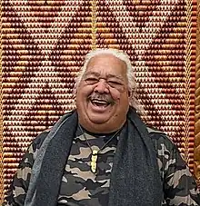 He has worked in a wide variety of mediums, including printing, painting, wood, stone, and bone, as well as traditional tattooing.[4] In 1975 he began printing t-shirts using wooden blocks.[7] He experimented with other mediums, but initially found it difficult to obtain tools and materials.[7] In 1996 he oversaw the creation of the Punanga Nui market.[8] In 2002 he published a poetry collection, Speak Your Truth.[9] His work is displayed at the Punanga Nui in Avarua and the University of the South Pacific campus.[10] In 2016 he was commissioned, alongside New Zealand-based artist Michel Tuffery, to create a carved wooden gateway for the RSA memorial cemetery to commemorate the centenary of Cook Islands participation in the First World War.[11]