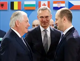 Mikheil actively promoted Georgia's membership in NATO. Janelidze participated in the first NATO-Georgia Commission at a NATO Summit in Warsaw in 2016. The commission, held at the level of Foreign Ministers, adopted a joint-statement, which welcomed Georgia’s engagement in strategic discussion on Black Sea security, inauguration of the Defense Institution Building School, holding the first ever NATO-Georgia exercise, open to partners, decided on new steps to intensify the cooperation, to help strengthen Georgia’s defense capabilities, interoperability and resilience capabilities, including increased support for Georgia’s Training and Education, through a possible trust fund project, and Strategic Communications, to provide support to the development of Georgia’s air defense and air surveillance, and also to deepen focus on security in the Black Sea region. It was stated that both the existing and new initiatives aim to strengthen Georgia’s defense and interoperability capabilities with the Alliance and are helping Georgia, an aspirant country, progress in its preparations towards membership. Allies reaffirm all elements of the Bucharest decision, as well as subsequent decisions, welcomed the significant progress realized since 2008, and stated that Georgia’s relationship with the Alliance contains all the practical tools to prepare for eventual membership. Foreign Minister Janelidze reaffirmed Georgia’s determination to achieve NATO membership, as a top foreign policy priority for Georgia.[38] In September 2016, NATO Secretary General Stoltenberg and ambassadors from all NATO Allies visited Georgia and took part in a NATO-Georgia Commission.[39] In December 2017, Janelidze participated in another NATO-Georgia Commission meeting held in Brussels, which was described as "very constructive” by NATO’s Secretary General Jens Stoltenberg. The Secretary General also stated that the implementation of the NATO-Georgia Substantial Package was marking "impressive progress." U.S. Secretary of State Tillerson stated he had a productive discussion with Georgian Foreign Minister Janelidze in the frame of the ministerial.[40] "US strongly supports Georgia’s membership in NATO. We are looking forward to completing all the steps for that to happen", – Rex Tillerson said.