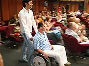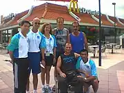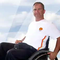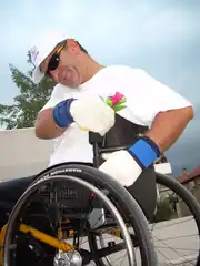 Mile Stojkoski (Macedonian: Миле Стојкоски; born 4 May 1965), is a Macedonian athlete and humanitarian known for going on long-distance marathon runs (ultramarathons)[1] in his wheelchair preceding the Summer Olympic Games.[2] In 1996 he experienced a spinal cord injury from a motorcycle accident leaving him paraplegic, losing use of both his legs. After much emotional struggle and learning about living with his disability he got involved in sports and humanitarian nonprofit organizations. This eventually led him to focus on ultramarathons in his wheelchair with primary goal to raise public awareness and funds in support of people with disabilities in Macedonia. Since 2004 he has gone on nine marathons (4 ultramarathons) gaining public recognition and awards. On 15 March 2012 he started his 10th marathon from Kruševo, Macedonia heading for the 2012 London Summer Olympics.[3][4]