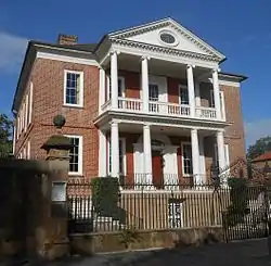 The Miles Brewton House is a National Historic Landmark residential complex located in Charleston, South Carolina. It is one of the finest examples of a double house (a reference to the arrangement of four main rooms per floor, separated by a central stair hall) in Charleston, designed on principles articulated by Andrea Palladio. Located on two acres, its extensive collection of dependencies makes it one of the most complete Georgian townhouse complexes in America. The house was built ca. 1765-1769 for Miles Brewton, a wealthy slave trader and planter.[3]