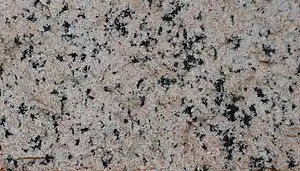 The granite is described as a light gray or light pinkish-gray to a medium, slightly pinkish or pinkish and greenish-gray biotite granite with spots from 0.2 to 0.5 inches (5.1 to 12.7 mm) across and in some cases tapering out to 1 inch (25 mm) in length.[1] The biotite is typically in clots or short streaks. It is commonly locally gneissic.[6] The color of the stone is governed mainly by its feldspars, pink from the potash and green from the soda lime feldspar.[1]