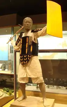 The Yayoi period is the Iron Age era of Japan from 1000 BC to 300 AD.[11][12][13] Japan transitioned to a settled agricultural society.[14][15] There was a big influx of farmers from the Asian continent to Japan. The Yayoi culture flourished from southern Kyūshū to northern Honshū. The rapid increase of roughly four million people in Japan between the Jōmon and Yayoi periods are partially due to migration and due to a shift from a hunter-gatherer to an agricultural diet with the introduction of rice cultivation.[16]