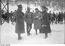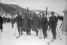 At the 1928 Winter Olympics, in St. Moritz, Switzerland, a military patrol competition was held. Because of a snowstorm the night before the competition, the start of the event was delayed 45 minutes to the cleaning up of the track. The competition was contested over a 30 km distance with an elevation difference of 1100 metres. The starting point was on a height of 2,108 metres, the highest point at 2,877 metres, and the goal in the valley at 1,850 metres.[1] Nine countries with 36 military patrol runners participated in this event.
