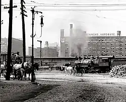 About that time, railroads lines were established from St. Louis to the western frontier.[5] Mill Creek Valley became a combination of residential and industrial section of the city, with factories and railroad yards,[4] reflecting the city's continued growth as a transportation hub and an industrial center.[7] Depots, roundhouses, bridges over railroad tracks, and many warehouses were built in Mill Creek Valley to support the railroad industry in St. Louis.[5]