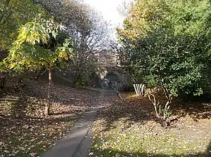 ![]() The site of the former station in 2018, now a small park (Arctic Park). Looking north-west along the course of the old track, the platform was on the left. The blocked-up tunnel entrance can be seen at the far end of the park. | |