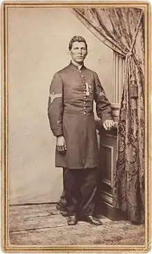 Wearing a large medal, could be the Medal of Honor which would place this photo in 1865 when he was awarded the medal.