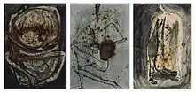 At the beginning of her art career, at the turn of the 1980s and 1990s, Miluše Poupětová dealt with two main topics, the first one was the role of women seen through the prism of her experienced motherhood, we may see this topic in her paintings as well as in her drawings. The second topic was the landscape. Her series called Hurt Sketchbook the bigger part of which is now in a private art collection in the USA combines several techniques (ink, natural pigments and dye substances undergo her destructive interventions – scratching, carving, polishing and burning). The colours from this period used in her paintings and drawings are dark, reflecting emotions like fear and worries. In her landscape painting, she focuses on little hidden places in the nature, seen from a subjective point of view, where the reflection is a frequent motif.