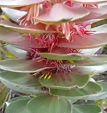 The inflorescence is broadly cylinder-shaped, 8–15 cm (3–6 in) long and 10–12 cm (4–5 in) in diameter, crested by smaller silvery pink leaves at an upright angle. These consist of many flower heads, each containing six to nine individual flowers and are set in the axil of an ordinary, flat leaf flushed mauve to carmine, particularly at its base. The outer whorl of bracts that tidely envelop the flower heads, are initially cartilaginous in consistency, becoming woody with age, carmine in colour, bluntly oval in shape, ¾–1½ cm (0.3–0.6 in) long and ½–¾ mm (0.2–0.3 in) wide, with a powdery outer surface a row of minute hairs along the edge. The bracts on the inside of the head are narrow, 1–1¼ cm (0.4–0.5 in) long and about ¼ cm (0.1 in) wide, and densely set with silky hairs.[4]