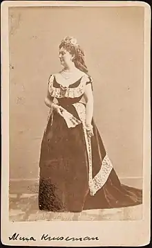She started her career as a performing-artist in Holland. During her first appearance in The Hague November 1872, she read the audience a chapter from her forthcoming feminist novel, Een huwelijk in Indië ("A Marriage in the Dutch East Indies").[4] From March to May 1873, her fame in the rest of the Netherlands grew as she toured together with Betsy Perk, another Dutch feminist pioneer, with a series of lectures.[4] The two women demanded that girls be given educational opportunities, and unmarried women to be granted the right to work and earn money by themselves.[4] The Kruseman–Perk performances were widely discussed in the press, albeit mostly negatively, but it turned the couple into public personalities overnight.[4] Due to health issues, Perk withdrew from the public eye after the tour, while Kruseman used her new notability in pursuit of her acting career.[4] Other Dutch male authors had made likewise performances, reading from their own writings, into a serious source of income. Kruseman wanted her own economic independence, no chance of a free performance of Mina Kruseman. The text they used: Zusters. Een schetsje uit onze dagen ("Sisters. A sketch from our days.") was written by Kruseman especially for this occasion. It tells the story of 5 almost adult sisters, the education of girls and women's lives afterwards: waiting for a spouse, and when a marriage was not provided, a life as a spinster. Kruseman's tantalizing appearance and her widely acclaimed performance art was quite a happening in the early years of feminist Holland. In addition, Kruseman expressed severe criticism on the level of art-criticism in The Netherlands: real talents were driven out of the country: with Eduard Douwes Dekker, Multatuli as a prominent example.