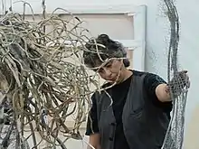 From 1982 to 1989, Alper was active in the theatre: first as a member of a performance art and comedy group called the Love Machine, and then with the Buttersticks, a performance art troupe that she co-founded.[9] In 1984, her papier-mâché work was featured in the journal Fiberarts.[22] She has exhibited her paintings and sculpture in several community venues around Los Angeles. After an exhibition at Random Gallery of Highland Park in 1988, she returned for a solo show in 1994, called "Drawing on the Wrong Side of the Brain", followed by a few group shows in the late 1990s.[9] Among her other solo shows are Raddack Gallery in 1987, and Sincere Technologies Gallery of Oakland in 1989.[9] Rosamund Felsen Gallery of Los Angeles, which has represented her since 2006, hosted shows for her in 2006, 2007, and 2013.[9][23]