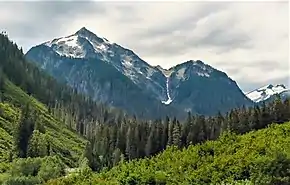 During the Pleistocene period dating back over two million years ago, glaciation advancing and retreating repeatedly scoured the landscape leaving deposits of rock debris.[4] The U-shaped cross section of the river valleys is a result of recent glaciation. Uplift and faulting in combination with glaciation have been the dominant processes which have created the tall peaks and deep valleys of the North Cascades area.
