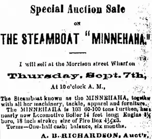 In September 1871, Minnehaha was sold at auction, either by the sheriff[11] or, more likely, by A.B. Richardson, auctioneer.[3] The auction was conducted on the Minnehaha itself, at the dock at the foot of Morrison Street in Portland, Oregon.[3] The purchaser at the auction was Barney Train, of East Portland.[11]