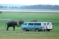 Large numbers of Sri Lankan elephants are attracted to grass fields on the edges of the reservoir during the dry season.[1] The Minneriya tank contributes to sustain a large herd. Elephants gathered here is numbering around 150–200.[4] Some reports account number of elephants to as high as 700.[5] They migrate here from Wasgamuwa National Park and benefit from food and shelter of the park's forest. Tourists visit Minneriya largely because of elephants, especially in dry season.