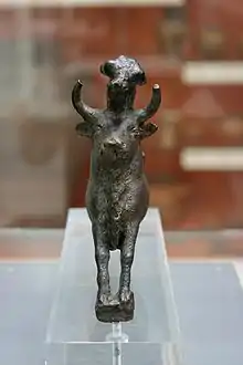 The Minoan bull leaper is a bronze group of a bull and leaper in the British Museum. It is the only known largely complete three-dimensional sculpture depicting Minoan bull-leaping.[1] Although bull leaping certainly took place in Crete at this time, the leap depicted is practically impossible and it has therefore been speculated that the sculpture may be an exaggerated depiction.[1][2] This speculation has been backed up by the testaments of modern-day bull leapers from France and Spain.[3]