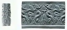 Weingarten writes: "The Minoan Genius is also known for carrying large beasts of all kinds to sacrifice... rarely depicted in an act of violence; though closely linked to sacrifice, the demon is only once seen to do the deed: on a seal impression from Zakro (Genius No.27 = Z 104), it slaughters a huge upright bull with sword or spear. The Genius moves indirectly on a cylinder from Kakovatos (CMS XI 208): a hero stabs an upright lion while the demon urges him on from behind."[1]