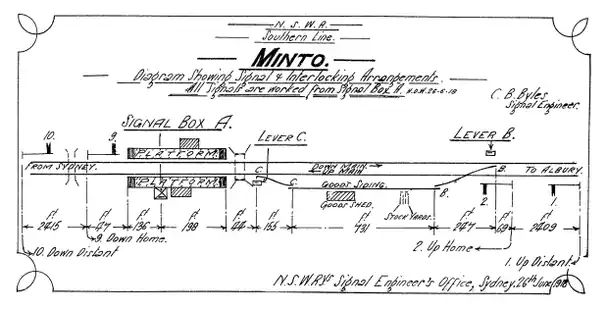 In its history, Minto hosted three level crossings: two to the north with one at 30 miles 35 chains and 50 links, and the other at Minto Road (30 miles and 22 chains), and one on the south side at Redfern Road. In 1922, a petition to the railway commissioners was successful resulting in the installation of, “wicket gates” at the Sydney-side level crossing.[56]