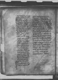 The codex contains the texts of the Gospel of Matthew (1:17-5:30; 17:24-24:29; 27:60-28:20) and Gospel of Mark (1:1-32), on 29 parchment leaves (size 28.6 cm by 21.9 cm).[3][4] The text is written in two columns per page, 27 lines per page.[3][5]